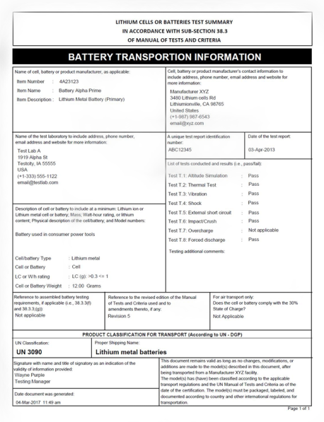 報告區分:對每個種類的鋰(lǐ)電池(chí)及製造商,以及測(cè)試實驗(yàn)室的不(bú)同,都必須分別的單獨提供試(shì)驗概要。